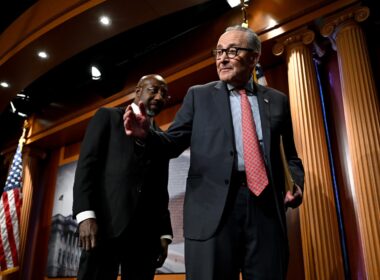 Senate Minority Leader Chuck Schumer, a Democrat from New York, right, and Senator Raphael Warnock, a Democrat from…