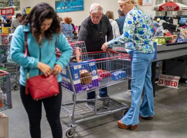 People dispense fuel at the pump at Costco Petrol Station in West Thurrock, Essex. The conflict in Iran…
