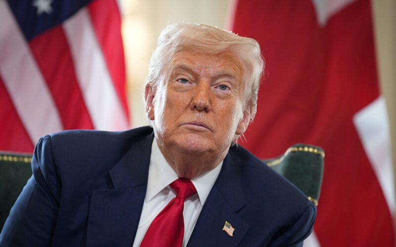 U.S. President Donald Trump talks to the media as he meets with British Prime Minister Keir Starmer (not pictured) at Trump Turnberry golf club on July 28, 2025 in Turnberry, Scotland.