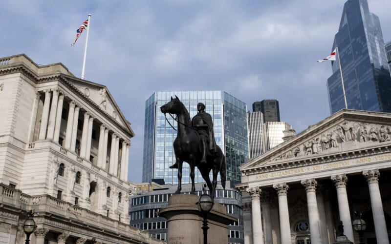 Bank of England, the Royal Exchange and the statue of the Duke of Wellington in the City of London on 19th February 2025 in London, United Kingdom.