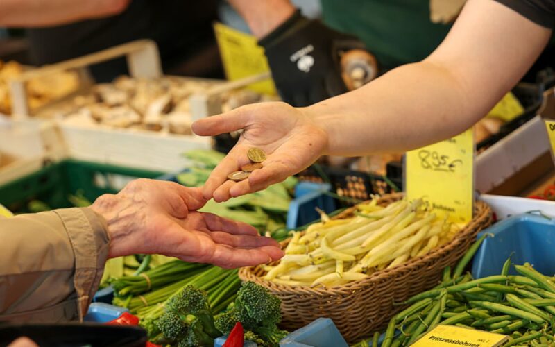 A vendor gives a customer change at stall at a farmers market in Hanau, Germany, on Saturday, Aug. 9, 2025.