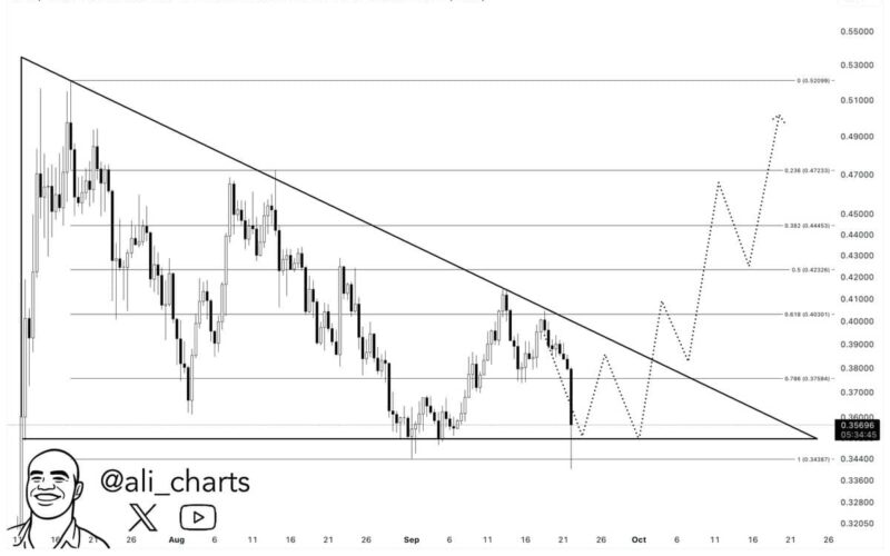 If the support holds, the pattern suggests that the price could begin to coil within the triangle. This setup may lead to a breakout above the descending trendline. Based on Fibonacci retracement levels, the next resistance areas are near $0.4, $0.42, and $0.44.