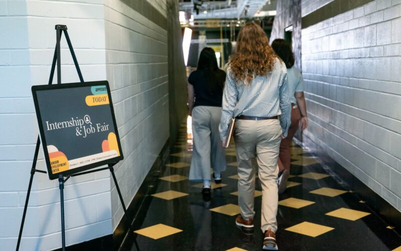 Job fair signage as job seekers arrive at the Appalachian State University internship and job fair in Boone, North Carolina, US, on Wednesday, Oct. 1, 2025.