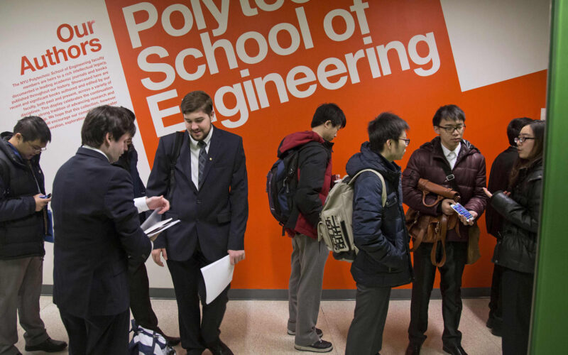 Students wait in line before the start a career fair at the New York University Polytechnic School of Engineering in the Brooklyn borough of New York.