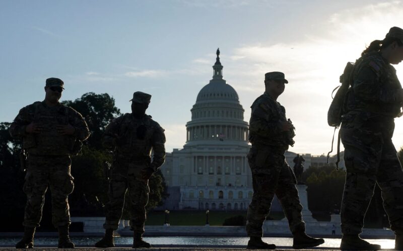 Members of the National Guard walk, with the U.S. Capitol in the background, during the first day of a partial government shutdown in Washington, D.C., U.S., Oct. 1, 2025.