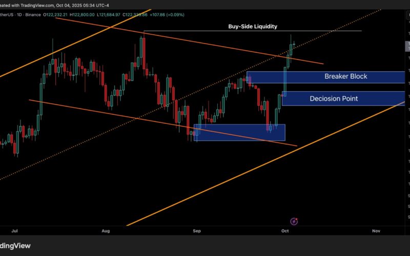 Bitcoin has continued its upward expansion, breaking through the mid-range resistance and invalidating the prior descending structure that defined September’s price action. The breakout was followed by a rapid move into the upper boundary of the macro range, likely targeting the buy-side liquidity just above the all-time high around $124K.