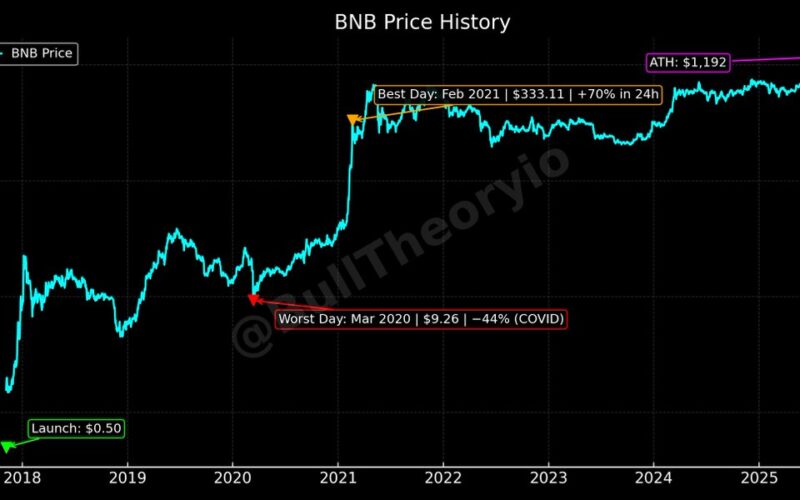 Bull Theory noted that BNB has grown from $0.50 at launch to over $1,192, delivering a +238,300% return with an average annual increase of around 167%. Despite setting a new price high, network activity on BNB Chain remains below its previous peak levels.