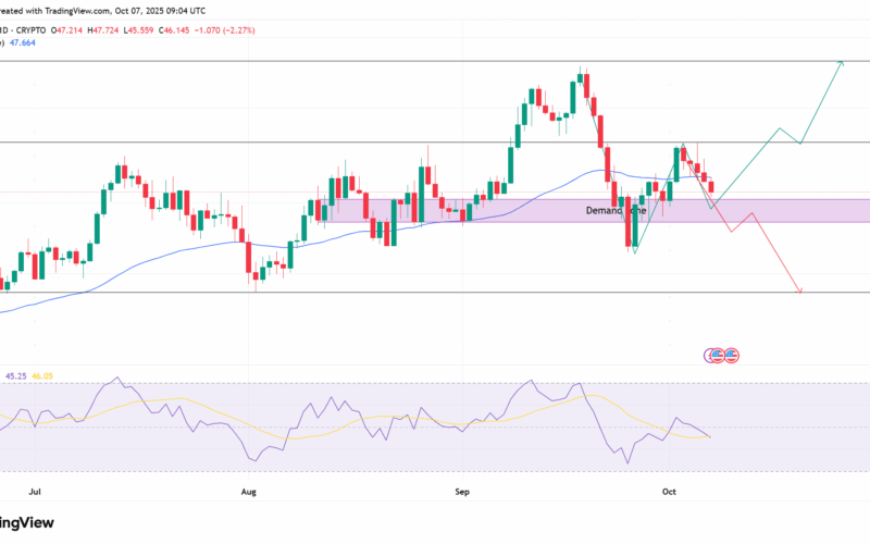 Hyperliquid (HYPE) has pulled back to $46, down 6% in the last 24 hours. The weekly performance remains slightly positive, showing a 2% gain. Trading volume continues to be strong, with over $647 million recorded in the same period.