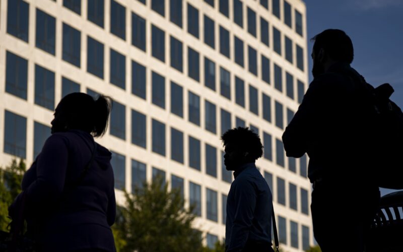 Commuters cross the street near the Federal Aviation Administration (FAA) headquarters on October 1, 2025 in Washington, DC.