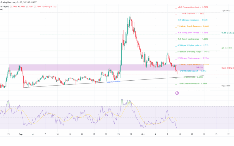 The Relative Strength Index (RSI) on the 4-hour chart is now around 30, placing it in oversold conditions. Early signs of a possible reversal are visible, but there is no confirmation yet. If the trendline and support hold, buyers may step in. If not, lower levels around $0.68 and $0.59 could come into play.