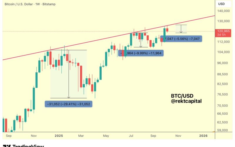 Bitcoin is trading near $121,600 after reaching a new all-time high above $126,000 earlier this week. The asset has slowed and is now moving sideways just below a major diagonal resistance that has capped the price for several months. Analysts are watching to see whether Bitcoin can break through or if it will be rejected once again.
