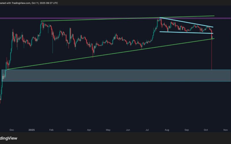 Despite the magnitude of the crash, the broader macro structure remains technically intact as long as the price holds above the green ascending trendline, which connects the major higher lows established earlier in 2025. A rebound from this region could preserve the long-term bullish structure and set the stage for a higher-low continuation pattern.