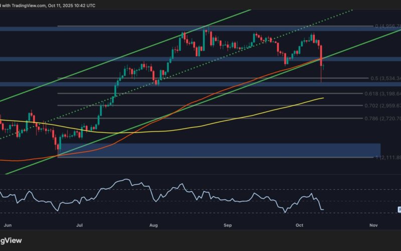 However, the RSI is still below 40, showing weak momentum. A daily close back above $4,000 could mark a short-term recovery, but failure to reclaim the channel would likely send ETH below the $3,000 range, which would mean the end of the bull market.