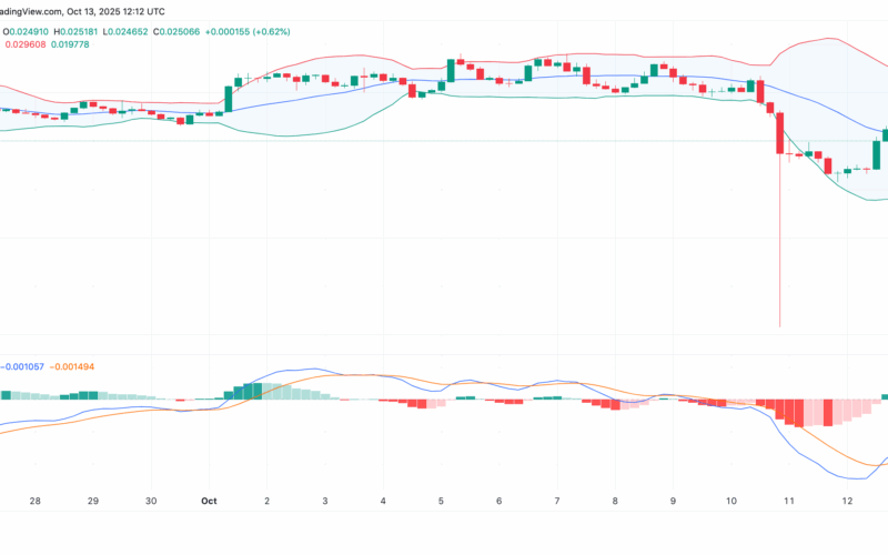 Short-term indicators are showing signs of recovery. The Bollinger Bands on the 4-hour chart show the price rebounding above the middle band, with resistance near $0.0296. The MACD line has crossed above the signal line, and the histogram is back in positive territory, showing early momentum in favor of buyers.