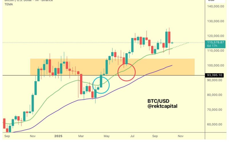 On the weekly chart, BTC continues to hold above the 21-week EMA, a level that has supported higher candle-bodied lows across the year. Rekt Capital marked past reactions where this EMA acted as a base for upward continuation. Bitcoin’s latest bounce has once again respected this moving average, now sitting near $115,578.