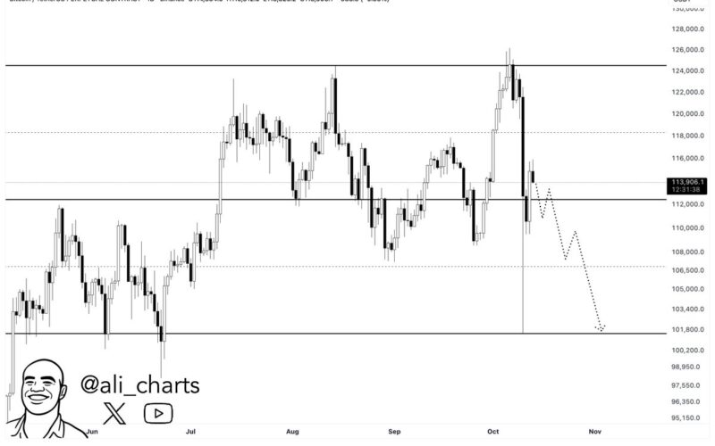 Ali Martinez posted a chart showing that Bitcoin could drop further if it fails to hold current support. His chart shows possible steps lower, with stops at $108,000 and $106,500. The lowest level on the chart points to $101,800.