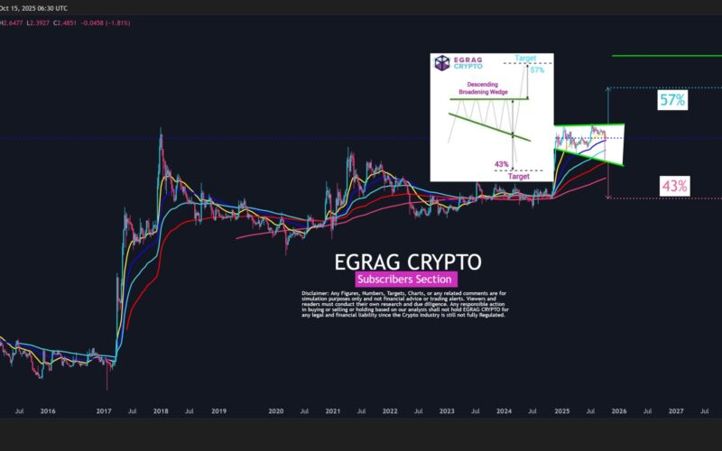 Crypto analyst EGRAG CRYPTO pointed to a descending broadening wedge on the chart. Based on this structure, there is a 57% chance of a break to the upside and a 43% chance of a move lower.