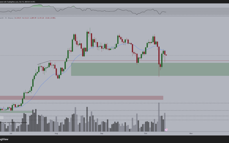 His chart shows ETH rebounding from the $3,600–$3,900 zone, a range that has held as support during past tests. At the time of the latest update, ETH was trading near $4,100 after pulling back from $4,600. Trading volume has started to rise again, which may signal new demand.