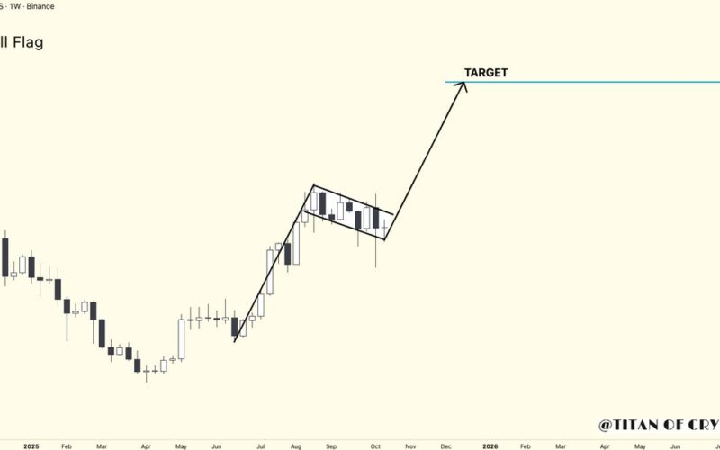 Titan of Crypto shared a chart showing a bull flag pattern on Ethereum’s weekly chart. The flag follows a sharp rally and is still intact. If the breakout occurs, the pattern points to a move toward $6,700. This is based on the height of the flagpole added to the breakout point.