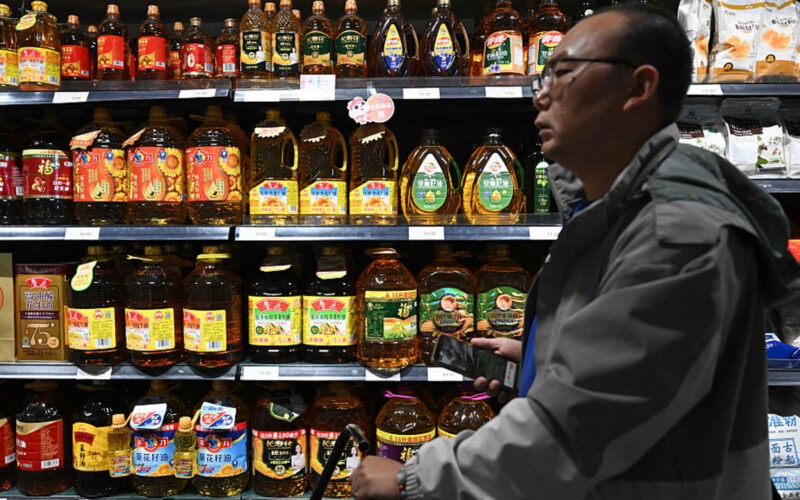 A shopper walks past shelves of cooking oil for sale at a supermarket in Beijing on October 15, 2025.