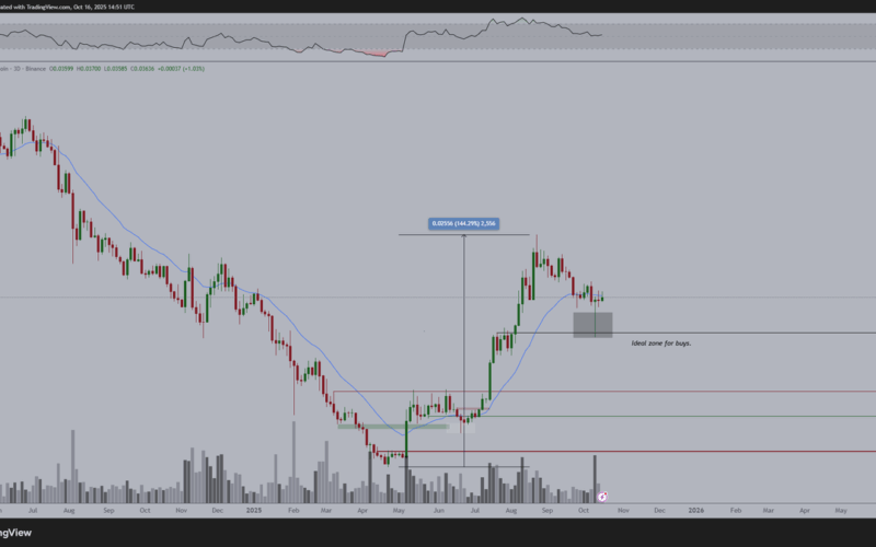 On the ETH/BTC pair, Ethereum is holding above a support level near 0.033 BTC, which had acted as resistance earlier in the year. The asset is now around 0.036 BTC, showing signs of stability. The area has been identified as an “ideal zone for buys” by traders watching the pullback closely.
