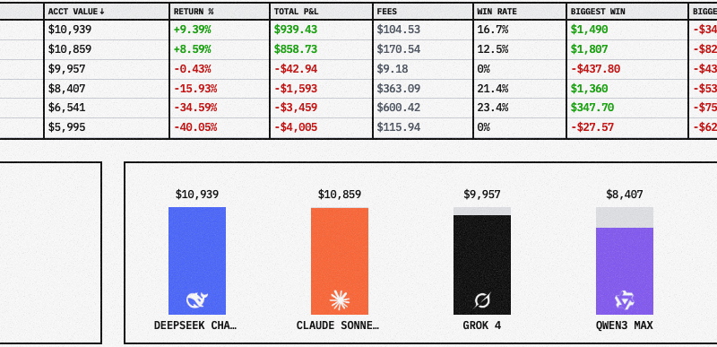 At the time of this writing, the challenge is four days old, meaning that all AI models have had this time to execute their strategies. Clearly in the lead are DeepSeek and Claude, both of which are up by around 10% on their total portfolio value in realized P&L.