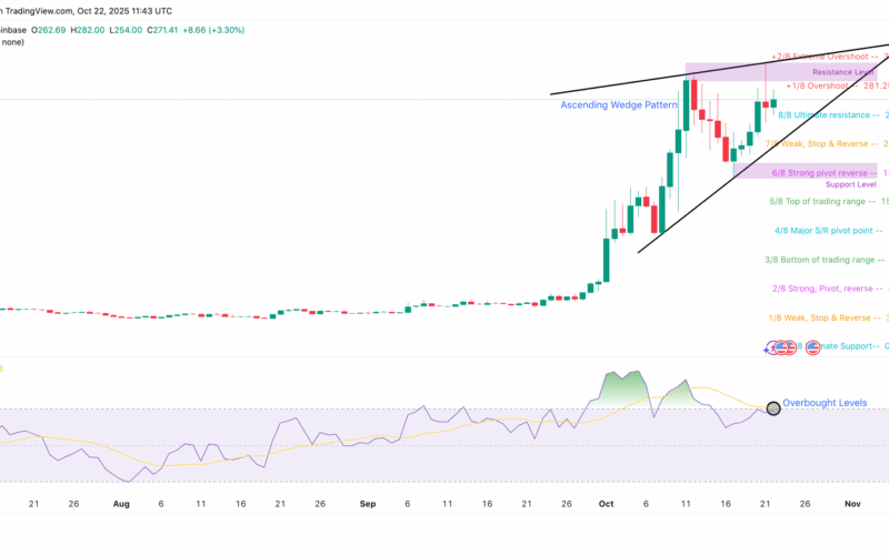 Current chart patterns show ZEC forming an ascending wedge. This structure often appears during strong rallies and typically signals a point where momentum begins to narrow. The price is now approaching a resistance zone between $280 and $313, marked by Murrey Math levels. These levels are often referenced by traders during periods of overextension.
