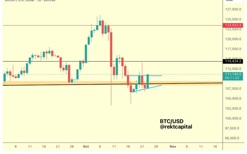 The daily chart shared by Rekt Capital shows a rising trendline with flat resistance around $110,800. This setup suggests a potential ascending triangle — a common pattern that often leads to upward movement. The asset has made several higher lows, which indicates steady demand.
