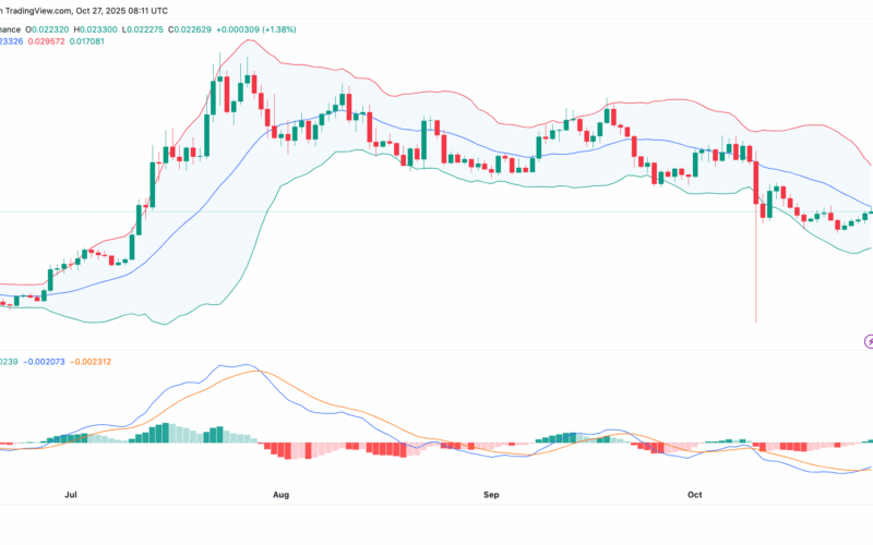 On the daily chart, Bollinger Bands have tightened, showing lower volatility. This setup often comes before a price move. PENGU recently bounced off the lower band around $0.01708 and is now trading near the 20-day average at $0.023. For momentum to build, the price would need to challenge the upper band near $0.029.