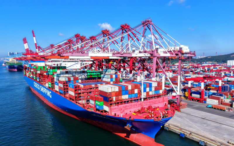 A cargo ship is loading and unloading foreign trade containers at Qingdao Port in Qingdao City, Shandong Province, China on July 28, 2025.