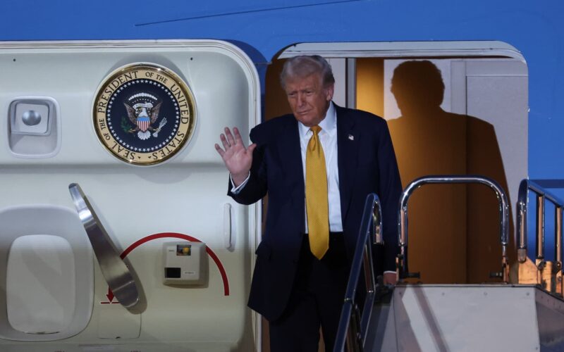 TOKYO, JAPAN – OCTOBER 27: U.S. President Donald Trump disembarks Air Force One as he arrives at Haneda Airport on October 27, 2025 in Tokyo, Japan.