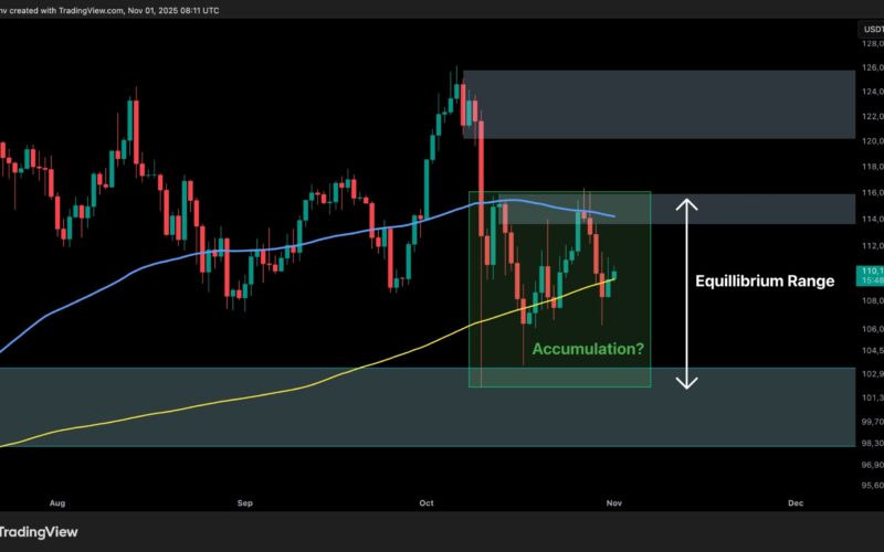 A confirmed daily close above the 100-day MA would likely trigger a breakout toward $120K–$122K, while a breakdown below $108K could expose the $102K–$104K institutional demand zone once again.