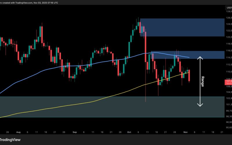 The market has repeatedly rebounded from the $103K–$108K demand zone, suggesting that buyers are still active at these levels. Yet, the series of lower highs below $116K indicates ongoing pressure from the supply zone, keeping the price locked in an equilibrium range between $105K and $116K.