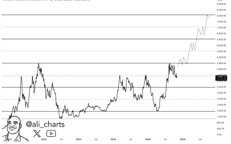 Ali Martinez outlined what he called the “dream scenario” for Ethereum. In this view, ETH would hold above $3,800, break through resistance near $4,900, and continue toward $8,000. His chart shows a step-by-step path higher, with pauses near $5,600, $6,400, and $7,200.