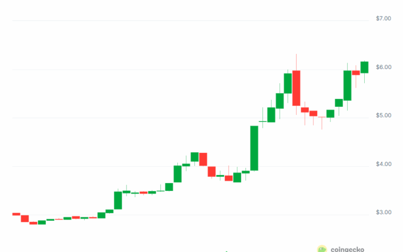 ICP currently trades at around $6.12 (according to CoinGecko’s data), representing a 27% increase on a daily basis and a staggering 100% surge in the last seven days.