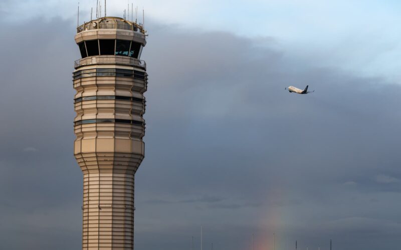 A Republic Airways plane takes off near the air traffic control tower at Ronald Reagan Washington National Airport (DCA) in Arlington, Virginia, US, on Tuesday, Oct. 28, 2025.