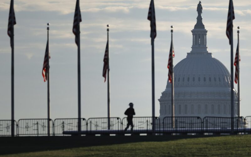 A visitor jogs past the Washington Monument during sunrise on November 5, 2025 in Washington, D.C. The record for longest shutdown in the U.S. Government was broken Wednesday as it entered its 36th day.