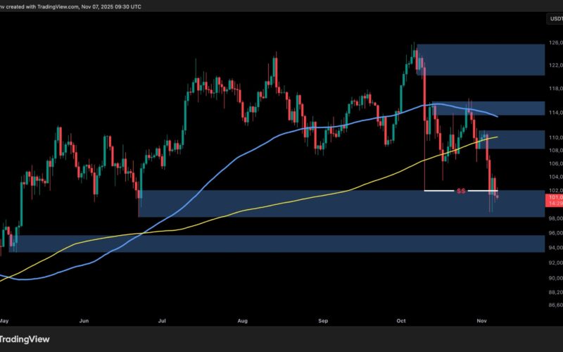 On the daily timeframe, BTC remains locked between the $100K–$102K demand block and the $114K resistance cluster, with both the 100-day and 200-day moving averages now acting as overhead resistance.