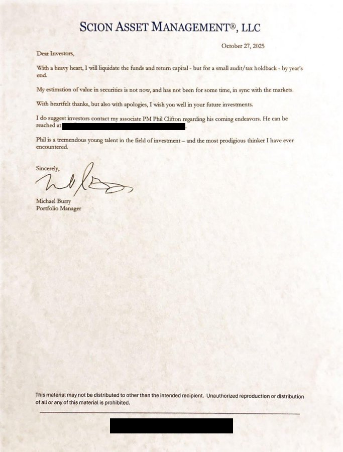 Burry told investors that he would “liquidate the funds and return capital — but for a small audit/tax holdback — by year’s end,” according to two people with direct knowledge of a letter he sent to investors.