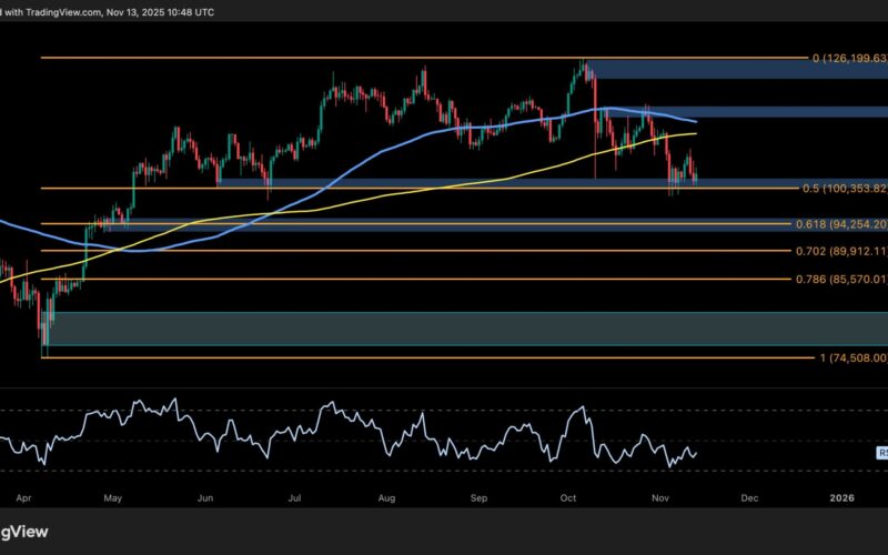 On the daily chart, BTC is reacting to the 0.5 Fib retracement at $100.3k after being held at the strong demand zone at $100k. The asset is still below both the 100-day and 200-day moving averages, both located around the $110k mark, which signals that momentum is tilted to the downside in the broader trend. The recent bounce failed to reclaim the key supply zone at $106,000, which is now acting as a resistance.