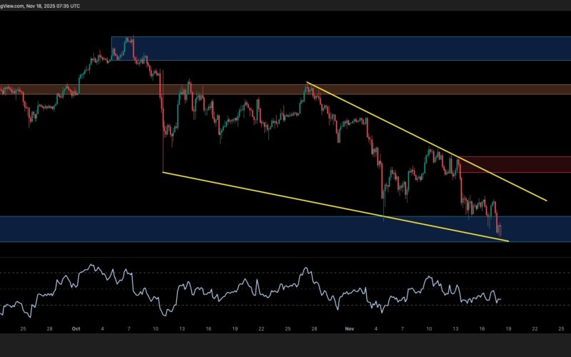 The current daily candle bodies remain compressed, with extended wicks to the downside, indicating absorption near the demand threshold. Should Ethereum stabilise and form a higher low structure within this region, a corrective phase toward $3.4K–$3.55K becomes plausible. However, a daily close below $2.95K would invalidate the wedge support and expose the broader $2.6K–$2.7K macro demand zone.