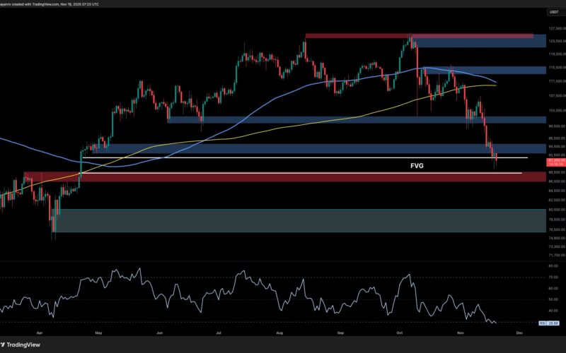 What is becoming more notable, however, is the growing separation between the price and its mean trend. The RSI has reached deeply oversold historical levels, matching the conditions seen during the mid-cycle retracements of April and August. If buyers manage to defend the $89K–$92K band, this zone could form the base of a multi-week consolidation, potentially marking a higher-timeframe accumulation zone before the next structural reversal.