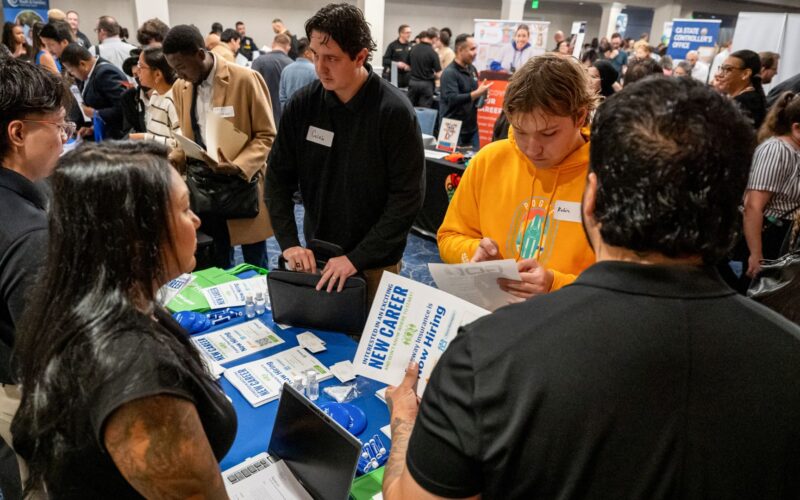 Job seekers speak with recruiters during the SacJobs Career job fair in Sacramento, California, US, on Thursday, Nov. 13, 2025.