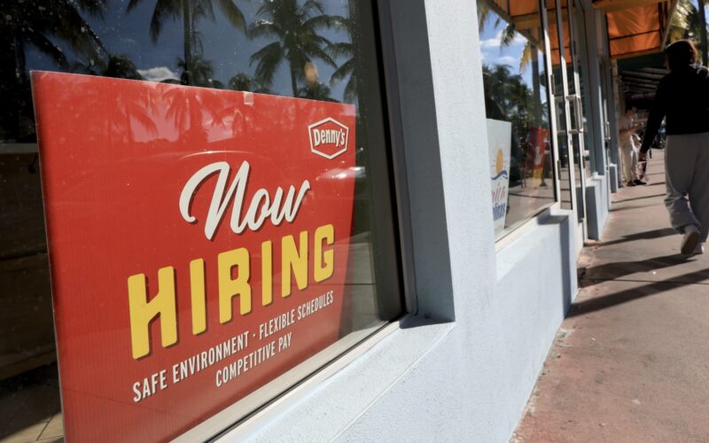 A ‘Now Hiring’ sign sits in the window of a Denny’s restaurant on Nov. 19, 2025 in Miami, Florida.