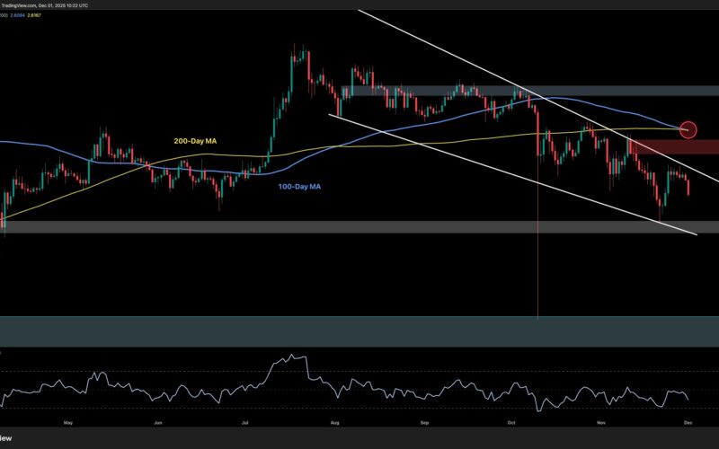 Both the 100-day and 200-day moving averages are curving downward and acting as dynamic resistance, while also printing a bearish crossover near the $2.60 mark. The RSI is also sinking below 40, showing weak momentum. The structure suggests that unless buyers reclaim the $2.50 level and break out of the descending channel, the trend will remain bearish, with $1.80 as the next possible support zone.