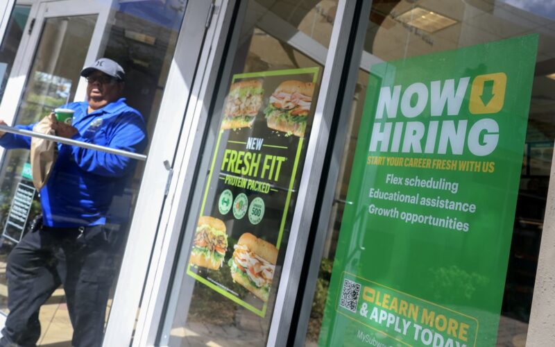 A ‘Now Hiring’ sign is taped to the window of a business on Oct. 3, 2025 in Miami, Florida.