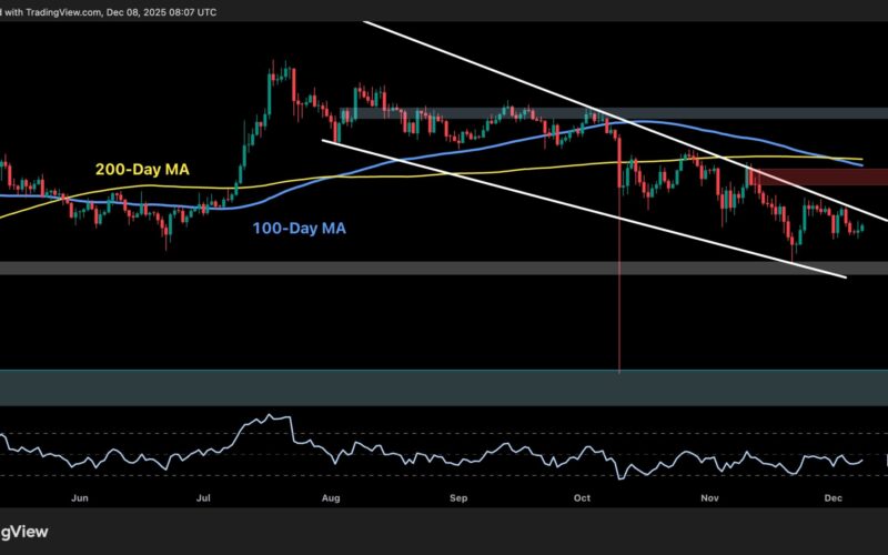 The channel’s upper boundary is also closing in, adding extra pressure on buyers to break the structure. The current RSI of around 44 indicates weak momentum, but not yet oversold, leaving room for both directions.