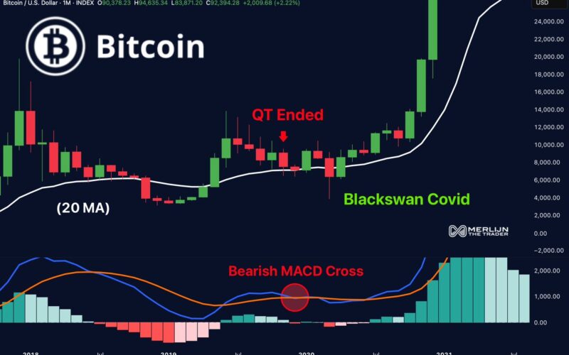 Simultaneously, Merlijn The Trader pointed to the monthly MACD showing a bearish cross, similar to the setup in 2019. Despite that signal, BTC is holding above its 20-month moving average.