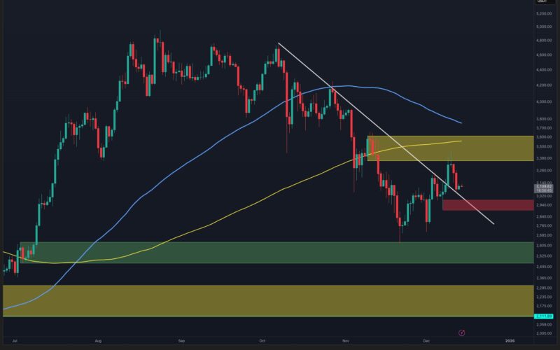 The asset is currently trading around the $3,1K level, below both the 100-day and 200-day moving averages. The 200-day moving average near the $3,4K to $3,5K zone aligns with a major daily supply area, which previously acted as a distribution region and continues to attract selling pressure.