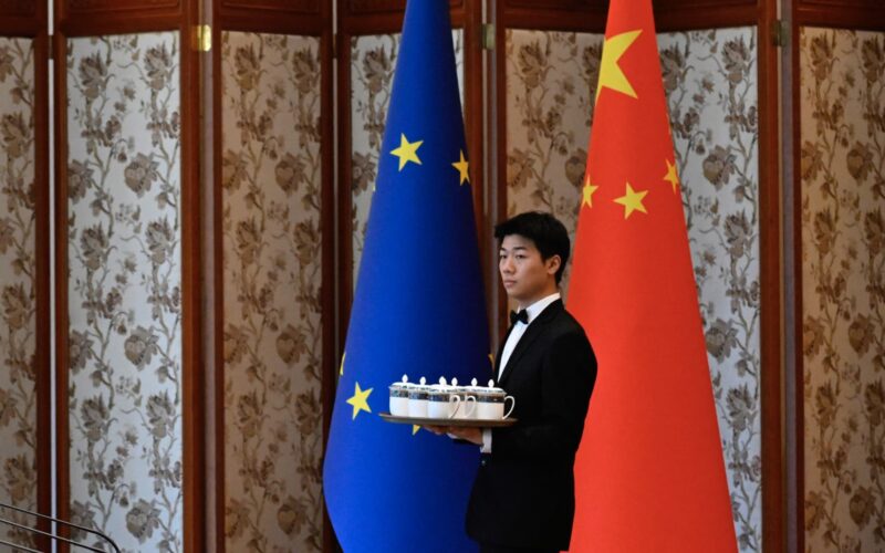 A staff member prepares for the arrival of Chinese Vice Premier Ding Xuexiang and EU Executive Vice-President for a Clean, Just and Competitive Transition, Teresa Ribera during China-EU Sixth High Level Environment and Climate Dialogue (HECD) at the Diaoyutai State Guest House in Beijing on July 14, 2025.
